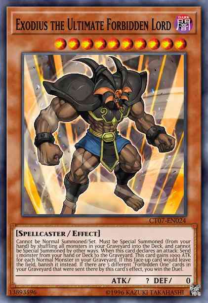 Cannot be Normal Summoned/Set. Must be Special Summoned (from your hand) by shuffling all monsters in your Graveyard into the Deck, and cannot be Special Summoned by other ways. When this card declares an attack: Send 1 monster from your hand or Deck to the Graveyard. This card gains 1000 ATK for each Normal Monster in your Graveyard. If this face-up card would leave the field, banish it instead. If there are 5 different "Forbidden One" cards in your Graveyard that were sent there by this card's effect, you win the Duel.