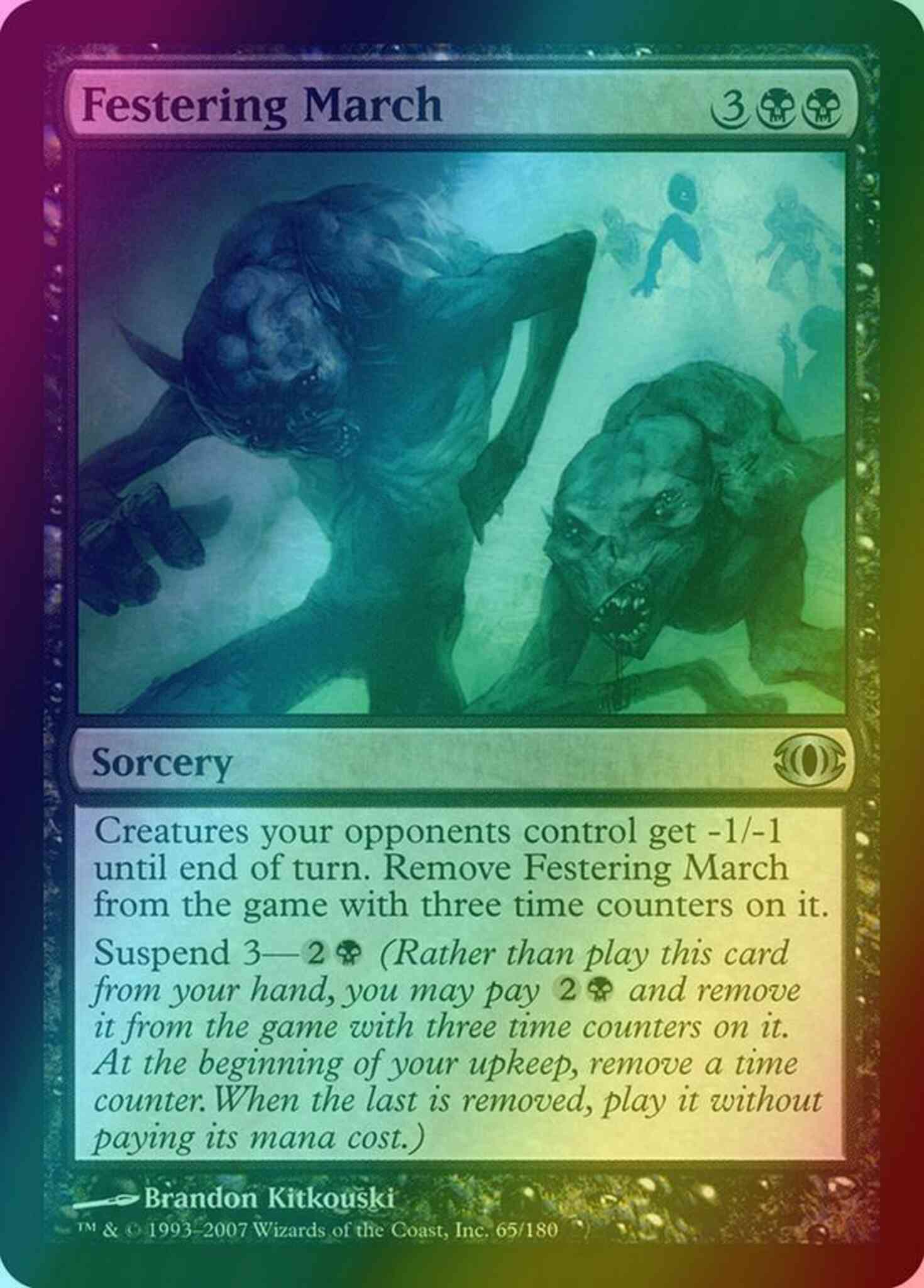 Creatures your opponents control get -1/-1 until end of turn. Exile Festering March with three time counters on it.