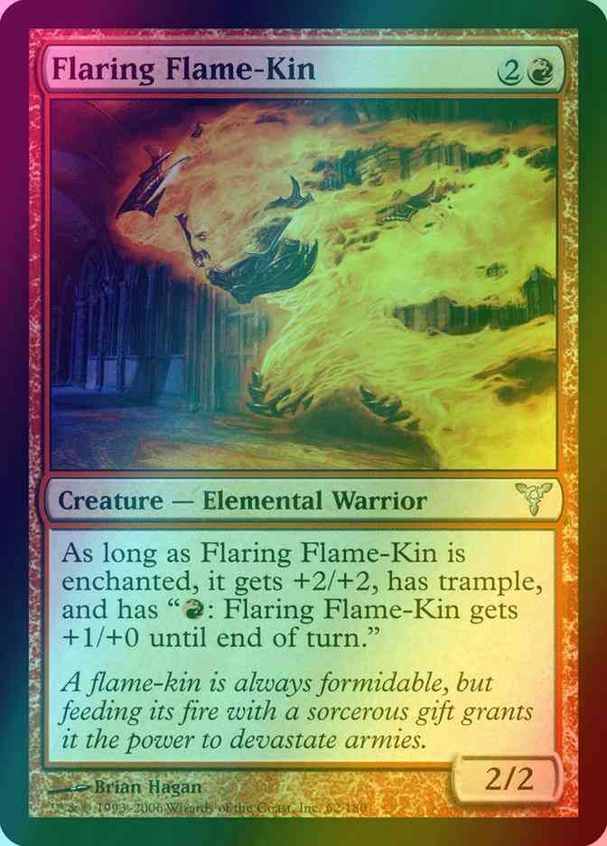 As long as Flaring Flame-Kin is enchanted, it gets +2/+2, has trample, and has "{R}: Flaring Flame-Kin gets +1/+0 until end of turn."