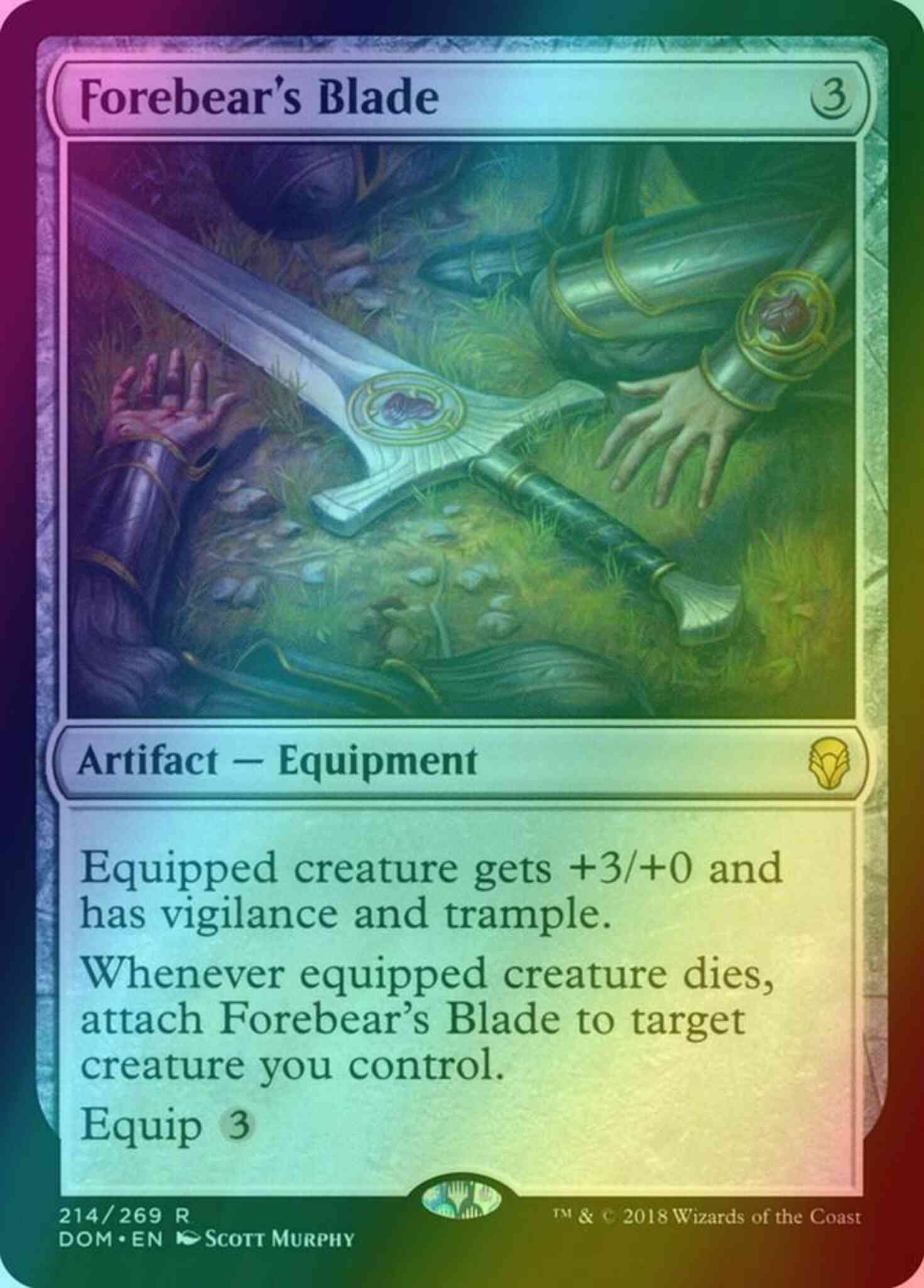 Card Text: Equipped creature gets +3/+0 and has vigilance and trample. Whenever equipped creature dies, attach Forebear's Blade to target creature you control. Equip {3}