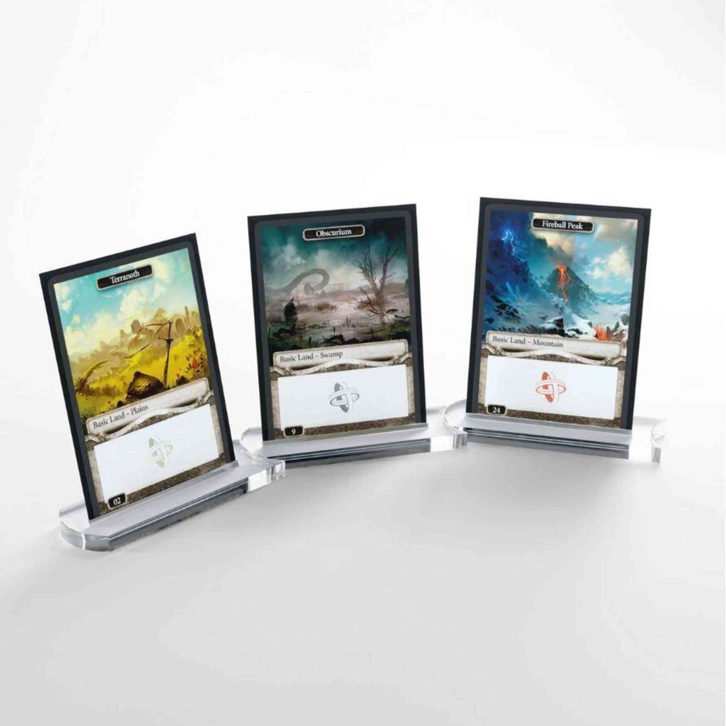 These minimalistic, flat, elegant Premium Card Stands can hold almost any gaming card (up to Standard Size, sleeved and unsleeved). Use them during gameplay to hide a card’s information from others or to increase a card’s visibility to other players. The ingenious, alignable design allows the Card Stands to be positioned next to each other in a line or (half-) circle. They are also perfect for turning your favorite card into a decorative element for any bookshelf.
