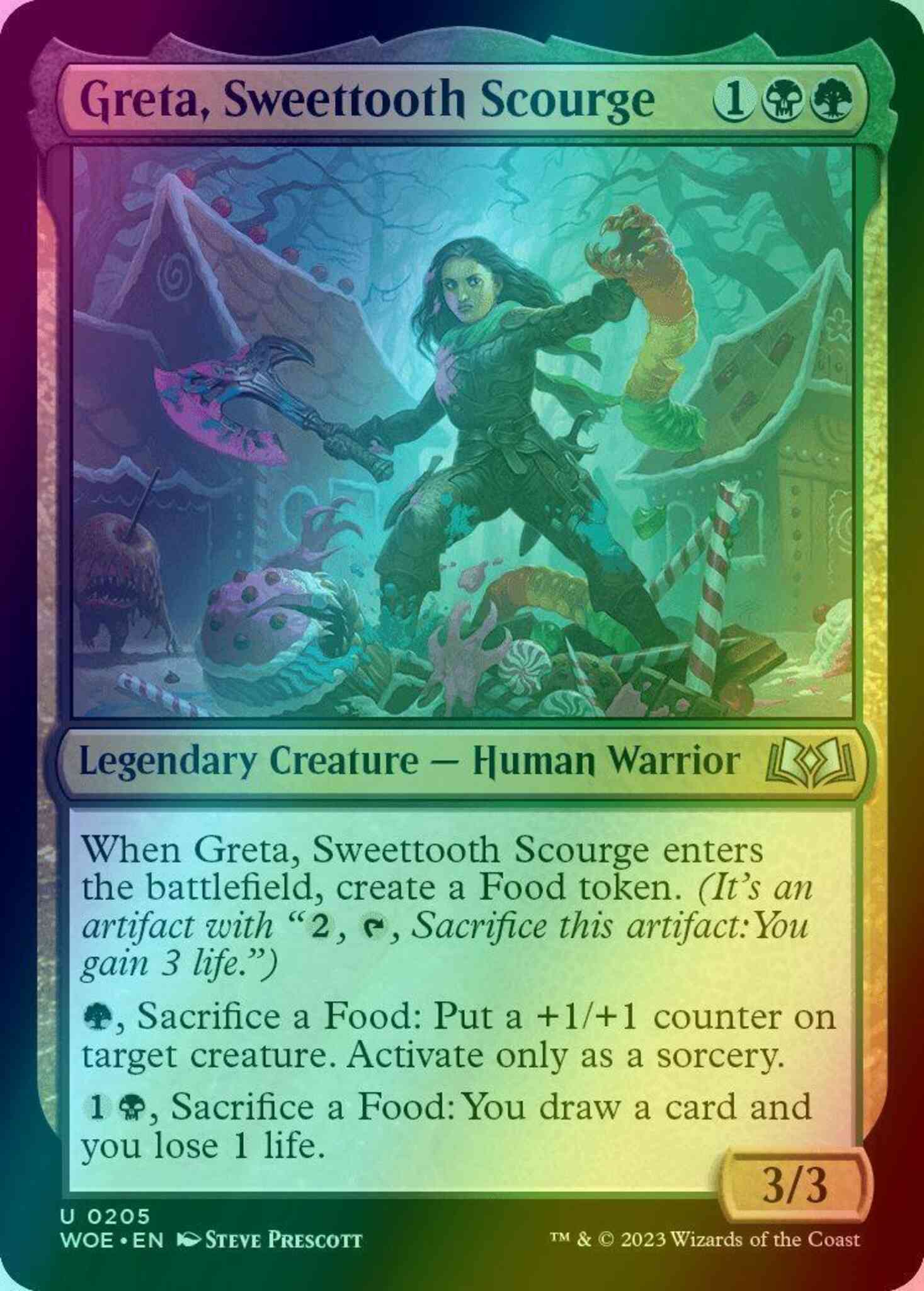 Card Text: When Greta, Sweettooth Scourge enters the battlefield, create a Food token. (It's an artifact with "{2}, {T}, Sacrifice this artifact: You gain 3 life.") {G}, Sacrifice a Food: Put a +1/+1 counter on target creature. Activate only as a sorcery. {1}{B}, Sacrifice a Food: You draw a card and you lose 1 life.