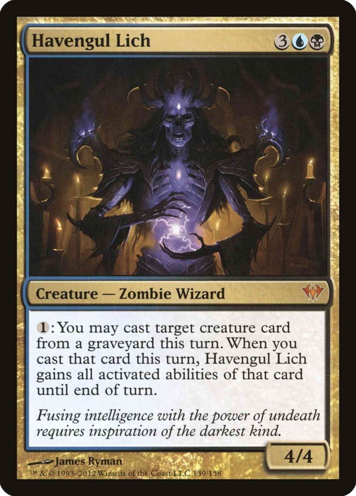 {1}: You may cast target creature card in a graveyard this turn. When you cast that card this turn, Havengul Lich gains all activated abilities of that card until end of turn.