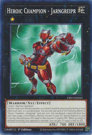 Card Text: 2 Level 1 Warrior monsters The first time each Warrior monster you control would be destroyed by battle or card effect each turn, it is not destroyed. You can only use each of the following effects of "Heroic Champion - Jarngreipr" once per turn. You can detach 2 materials from this card, then target 1 Level/Rank 4 Warrior monster in your GY; Special Summon it, and if you do, this card gains ATK equal to that monster's original ATK. When an attack is declared involving an opponent's monster: You can gain LP equal to half its ATK.