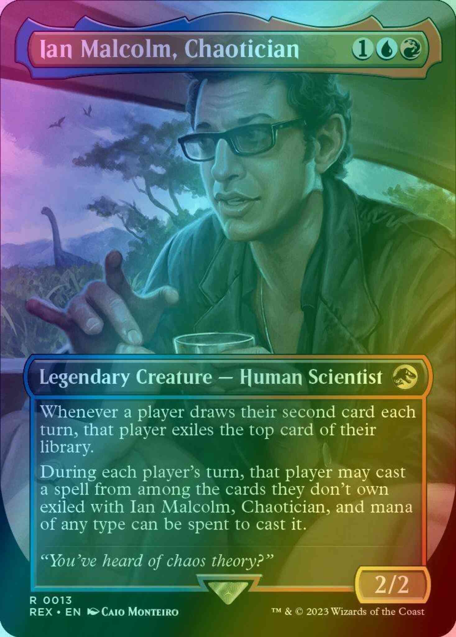 During each player's turn, that player may cast a spell from among the cards they don't own exiled with Ian Malcolm, Chaotician, and mana of any type can be spent to cast it.