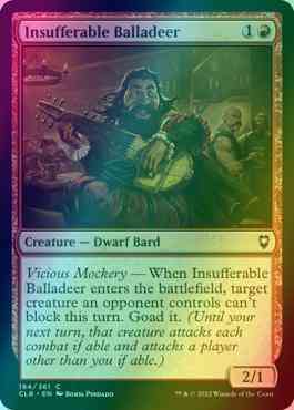 Vicious Mockery — When Insufferable Balladeer enters the battlefield, target creature an opponent controls can't block this turn. Goad it. (Until your next turn, that creature attacks each combat if able and attacks a player other than you if able.)