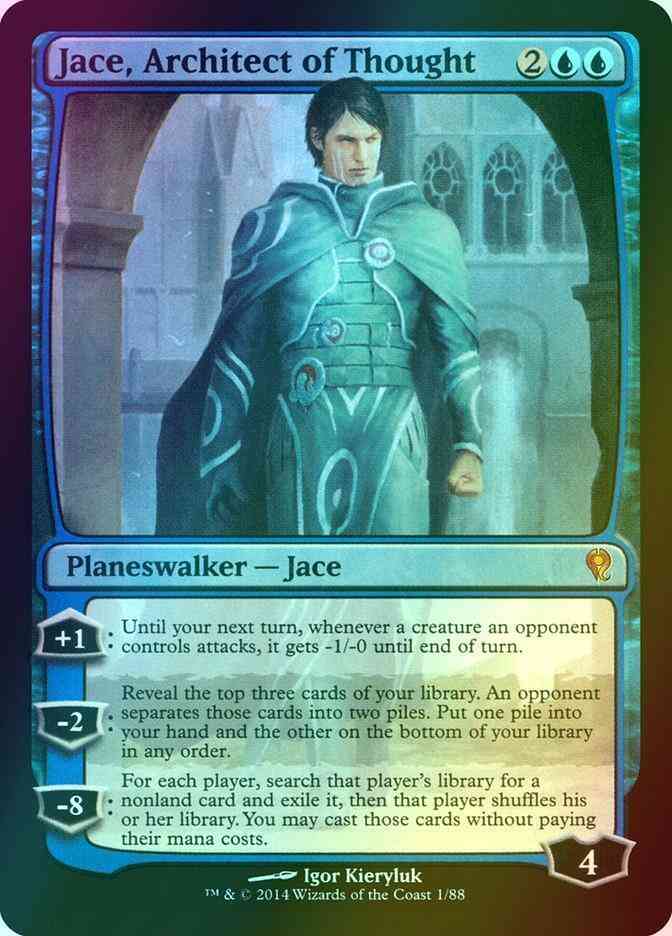 Card Text: [+1]: Until your next turn, whenever a creature an opponent controls attacks, it gets -1/-0 until end of turn. [−2]: Reveal the top three cards of your library. An opponent separates those cards into two piles. Put one pile into your hand and the other on the bottom of your library in any order. [−8]: For each player, search that player's library for a nonland card and exile it, then that player shuffles their library. You may cast those cards without paying their mana costs.