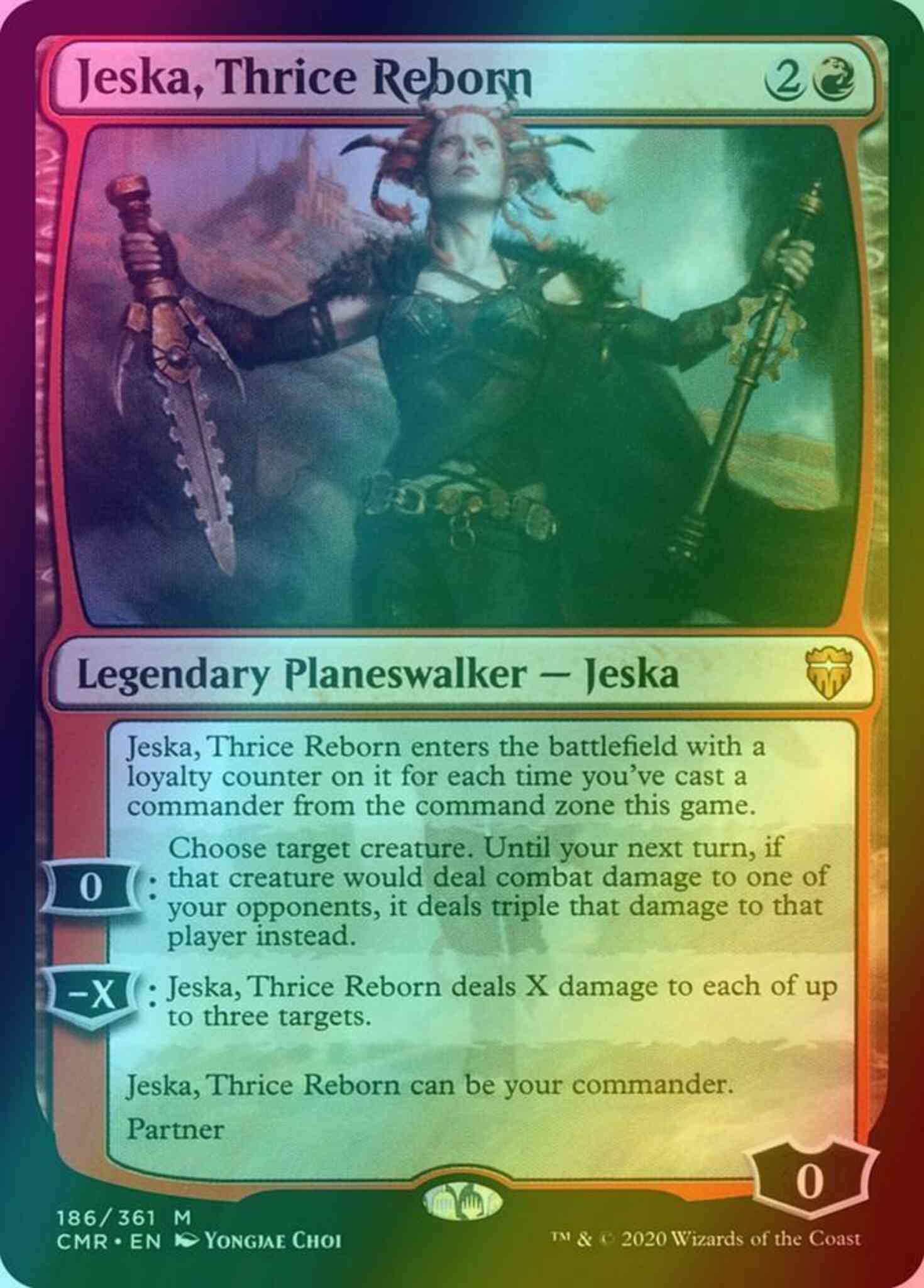 Card Text: Jeska, Thrice Reborn enters the battlefield with a loyalty counter on it for each time you've cast a commander from the command zone this game. [+0]: Choose target creature. Until your next turn, if that creature would deal combat damage to one of your opponents, it deals triple that damage to that player instead. [−X]: Jeska, Thrice Reborn deals X damage to each of up to three targets. Jeska, Thrice Reborn can be your commander. Partner (You can have two commanders if both have partner.)