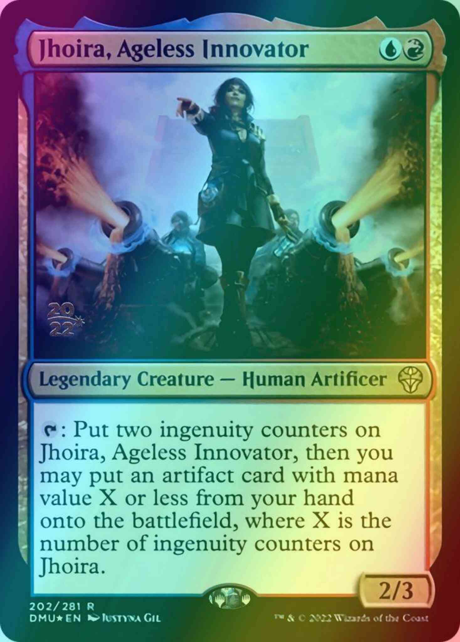 Card Text: {T}: Put two ingenuity counters on Jhoira, Ageless Innovator, then you may put an artifact card with mana value X or less from your hand onto the battlefield, where X is the number of ingenuity counters on Jhoira.