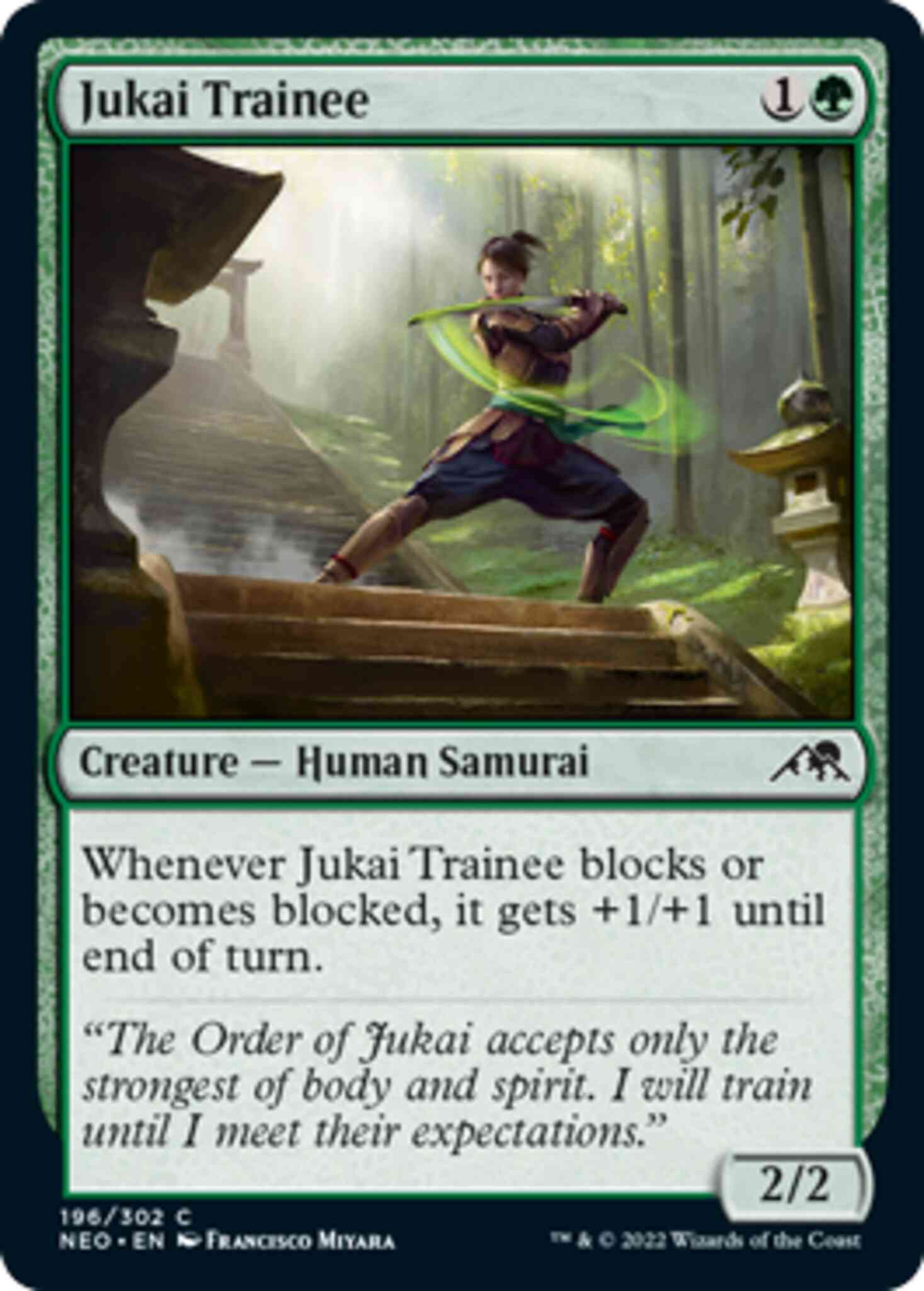 Card Text: Whenever Jukai Trainee blocks or becomes blocked, it gets +1/+1 until end of turn.