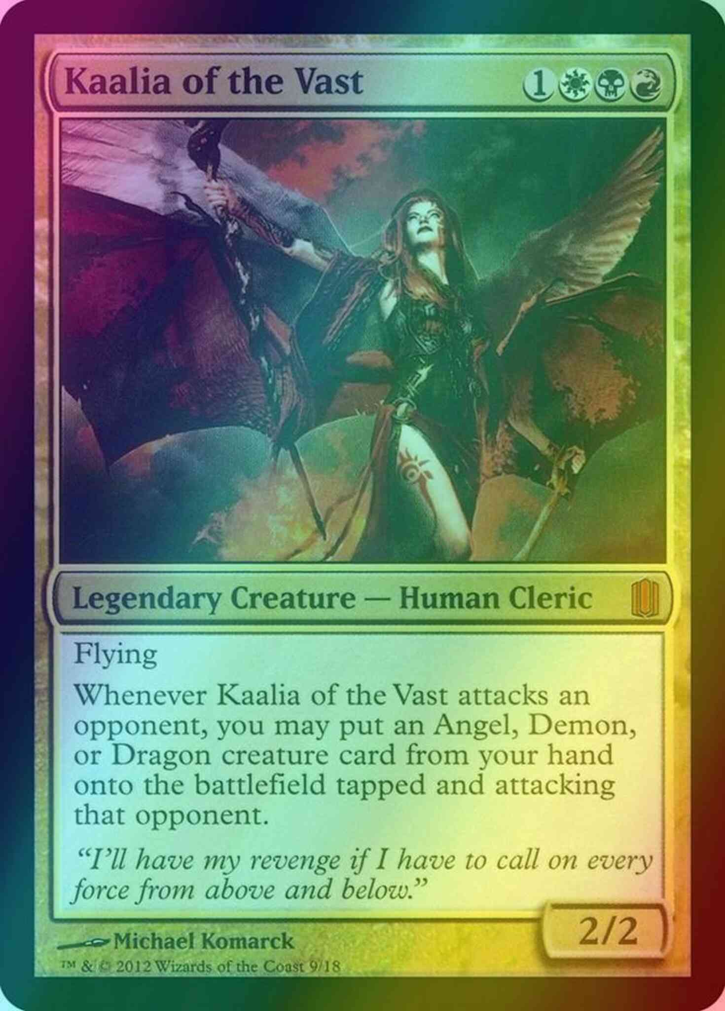 Whenever Kaalia of the Vast attacks an opponent, you may put an Angel, Demon, or Dragon creature card from your hand onto the battlefield tapped and attacking that opponent.