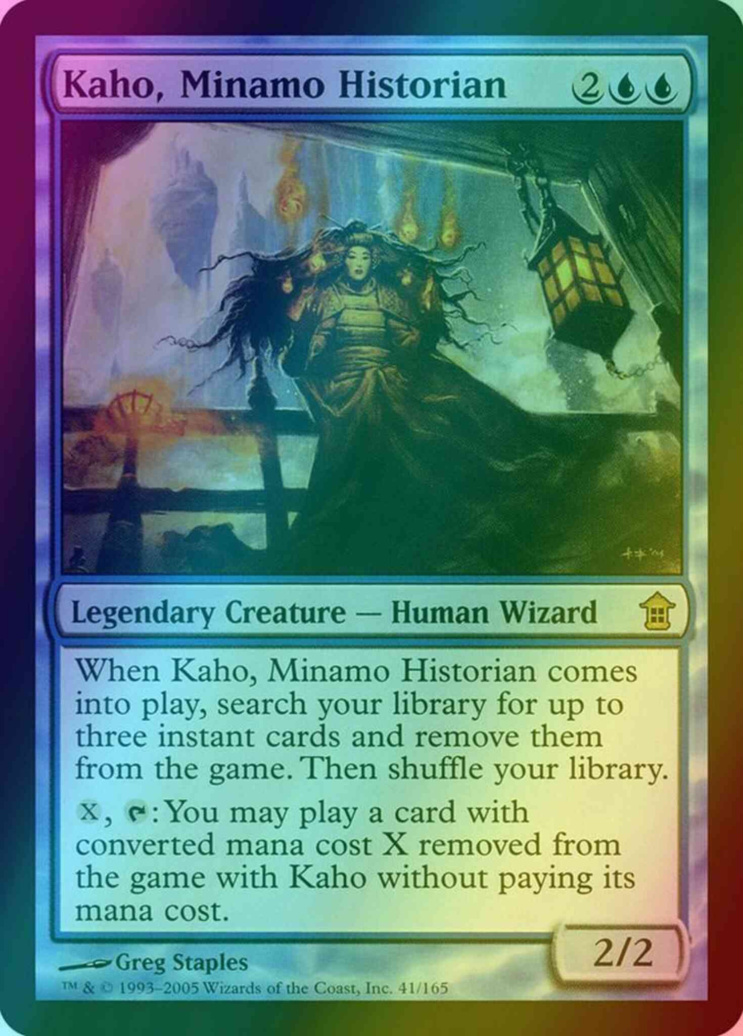 When Kaho, Minamo Historian enters the battlefield, search your library for up to three instant cards and exile them. Then shuffle your library.