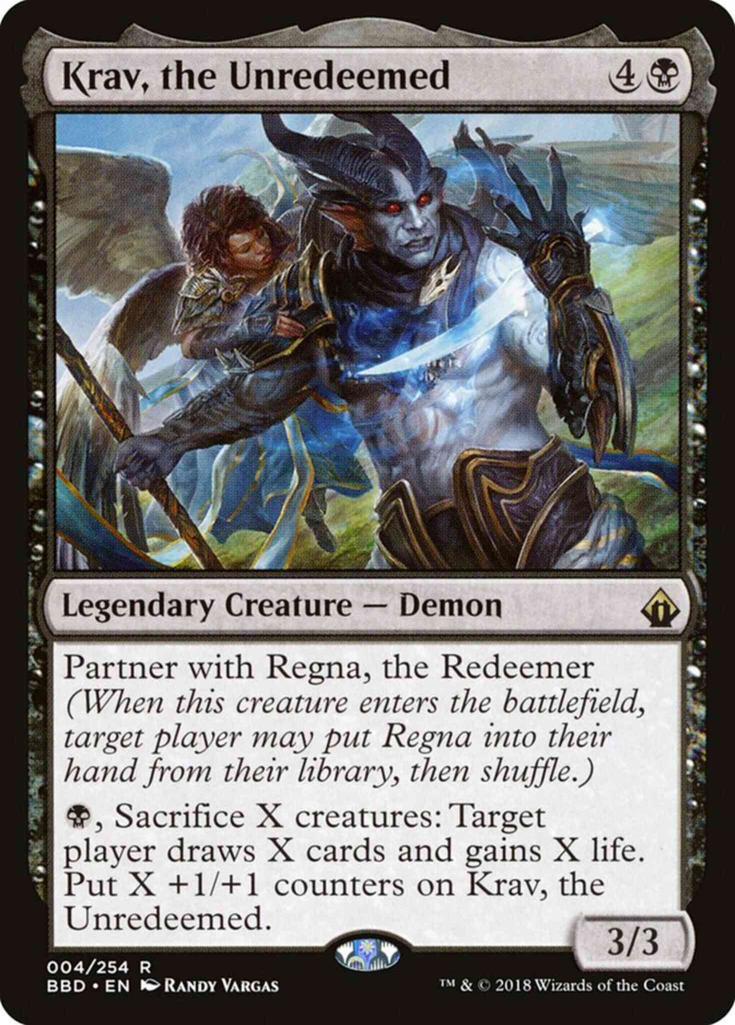 Card Text: Partner with Regna, the Redeemer (When this creature enters the battlefield, target player may put Regna into their hand from their library, then shuffle.) {B}, Sacrifice X creatures: Target player draws X cards and gains X life. Put X +1/+1 counters on Krav, the Unredeemed.