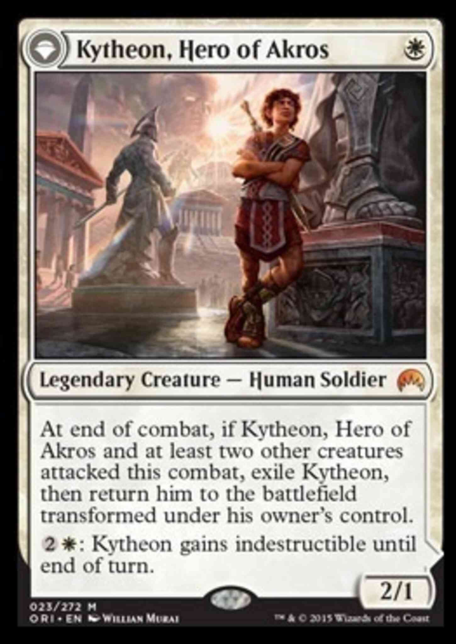 At end of combat, if Kytheon, Hero of Akros and at least two other creatures attacked this combat, exile Kytheon, then return him to the battlefield transformed under his owner's control.