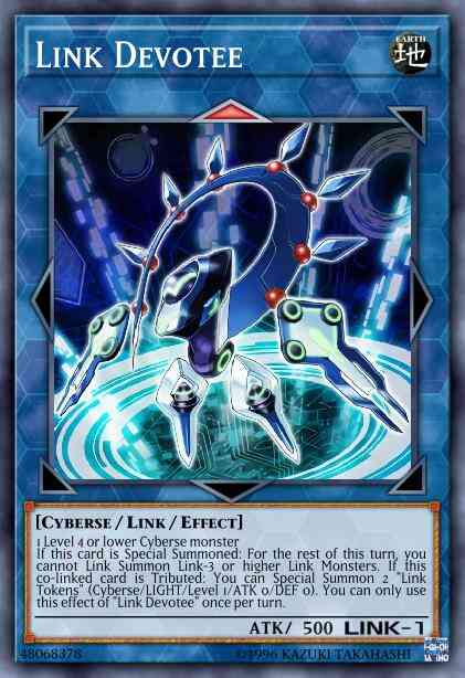 If this card is Special Summoned: You cannot Link Summon Link-3 or higher Link Monsters for the rest of this turn. If this co-linked card is Tributed: You can Special Summon 2 "Link Tokens" (Cyberse/LIGHT/Level 1/ATK 0/DEF 0). You can only use this effect of "Link Devotee" once per turn.