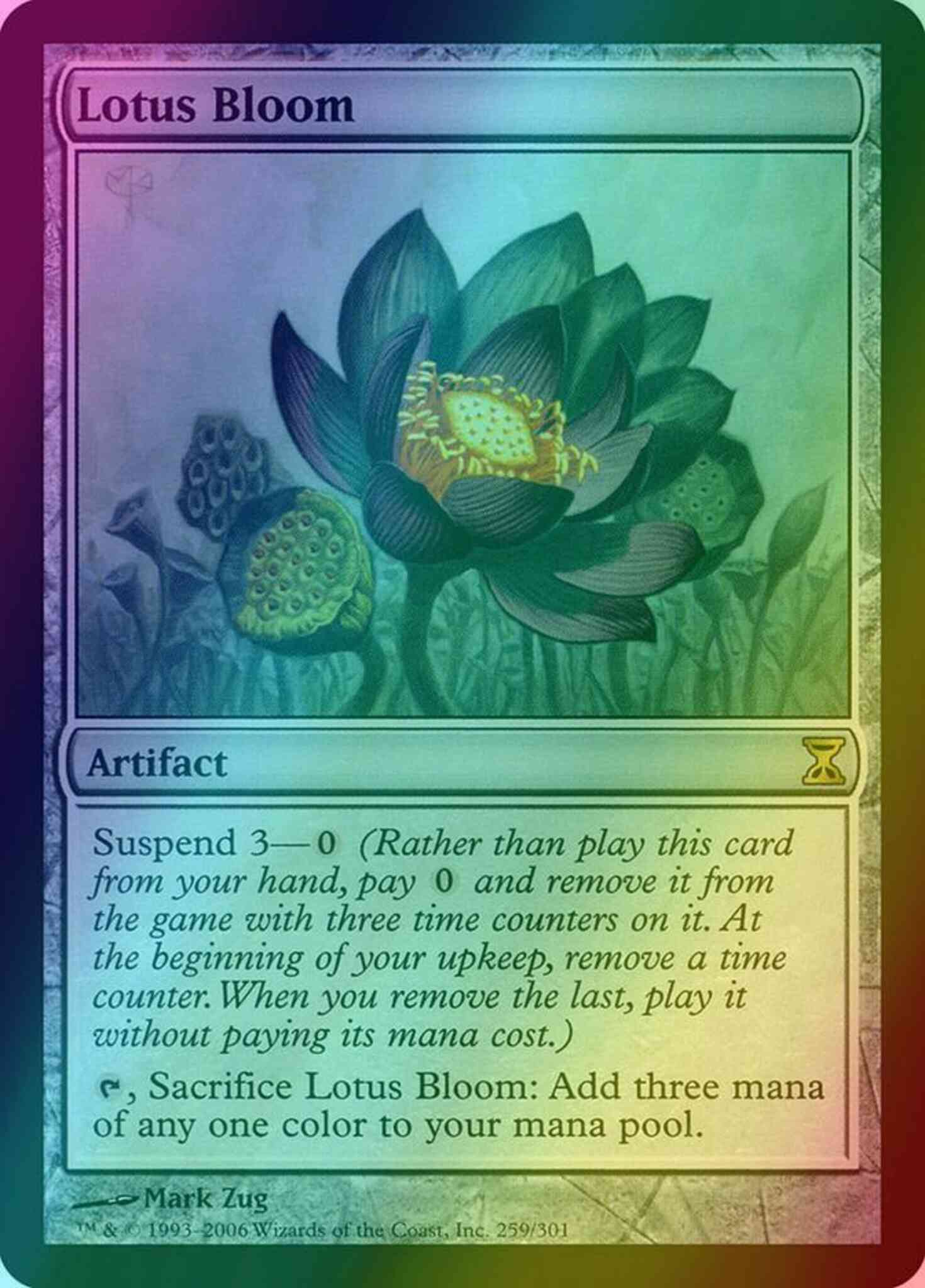 Card Text: Suspend 3—{0} (Rather than cast this card from your hand, pay {0} and exile it with three time counters on it. At the beginning of your upkeep, remove a time counter. When the last is removed, cast it without paying its mana cost.) {T}, Sacrifice Lotus Bloom: Add three mana of any one color.