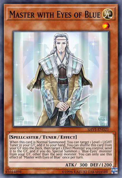 When this card is Normal Summoned: You can target 1 Level 1 LIGHT Tuner monster in your Graveyard; add it to your hand. You can shuffle this card from your Graveyard into the Deck, then target 1 Effect Monster you control; send it to the Graveyard, and if you do, Special Summon 1 "Blue-Eyes" monster from your Graveyard, other than the sent monster. You can only use this effect of "Master with Eyes of Blue" once per turn.