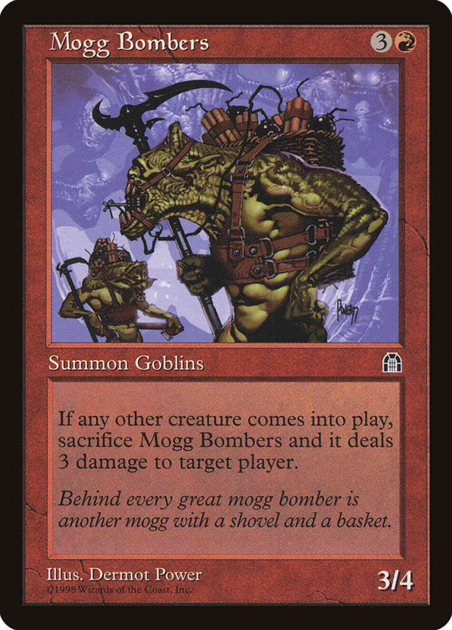 When another creature enters the battlefield, sacrifice Mogg Bombers and it deals 3 damage to target player or planeswalker.