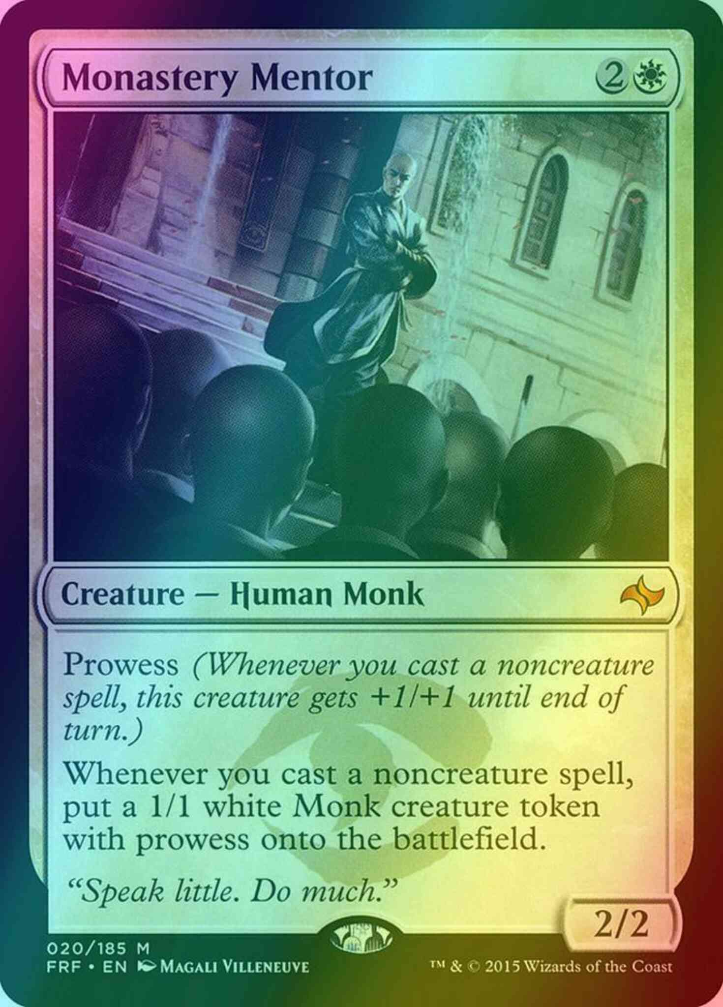 Card Text: Prowess (Whenever you cast a noncreature spell, this creature gets +1/+1 until end of turn.) Whenever you cast a noncreature spell, create a 1/1 white Monk creature token with prowess.