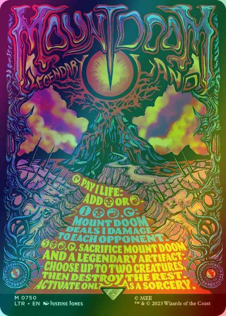 Card Text: {T}, Pay 1 life: Add {B} or {R}. {1}{B}{R}, {T}: Mount Doom deals 1 damage to each opponent. {5}{B}{R}, {T}, Sacrifice Mount Doom and a legendary artifact: Choose up to two creatures, then destroy the rest. Activate only as a sorcery.