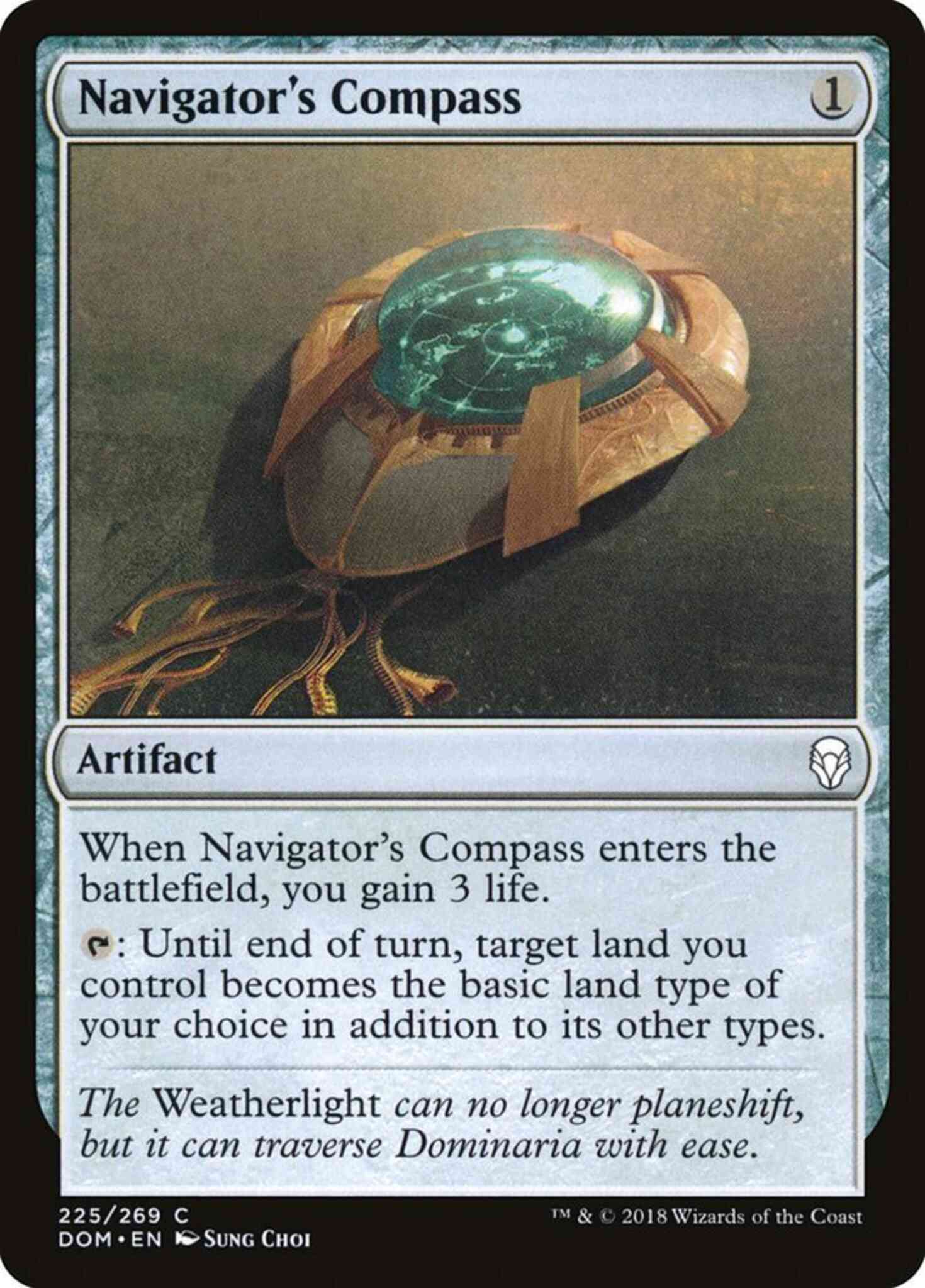 Card Text: When Navigator's Compass enters the battlefield, you gain 3 life. {T}: Until end of turn, target land you control becomes the basic land type of your choice in addition to its other types.
