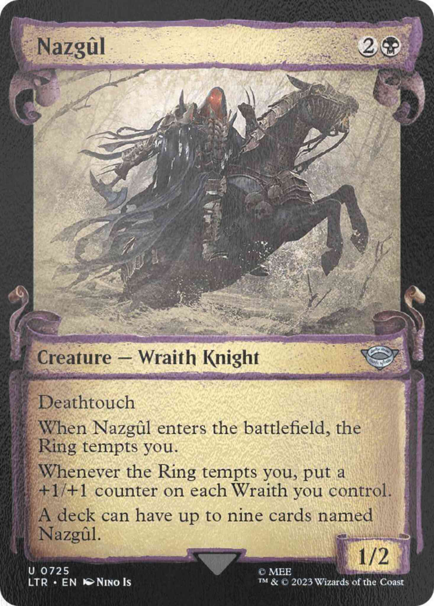Card Text: Deathtouch When Nazgûl enters the battlefield, the Ring tempts you. Whenever the Ring tempts you, put a +1/+1 counter on each Wraith you control. A deck can have up to nine cards named Nazgûl.