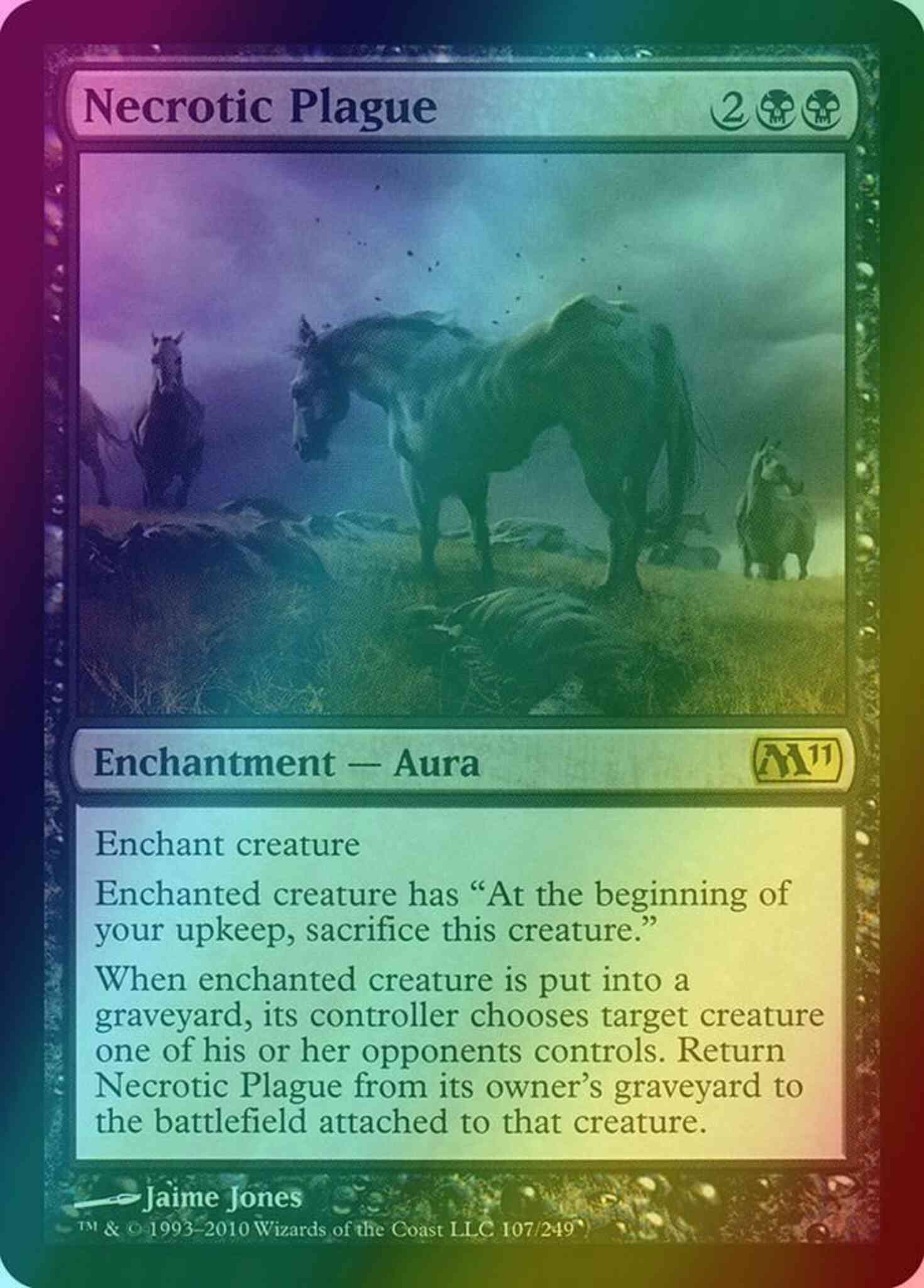 Card Text: Enchant creature Enchanted creature has "At the beginning of your upkeep, sacrifice this creature." When enchanted creature dies, its controller chooses target creature one of their opponents controls. Return Necrotic Plague from its owner's graveyard to the battlefield attached to that creature.