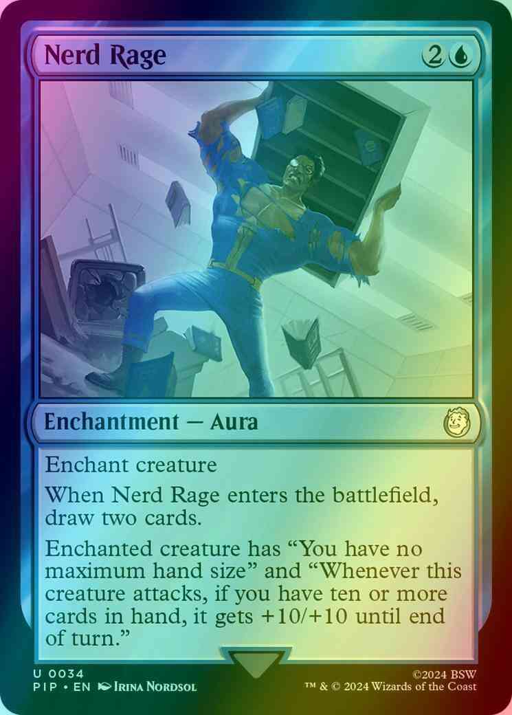 Card Text: Enchant creature When Nerd Rage enters the battlefield, draw two cards. Enchanted creature has "You have no maximum hand size" and "Whenever this creature attacks, if you have ten or more cards in hand, it gets +10/+10 until end of turn."
