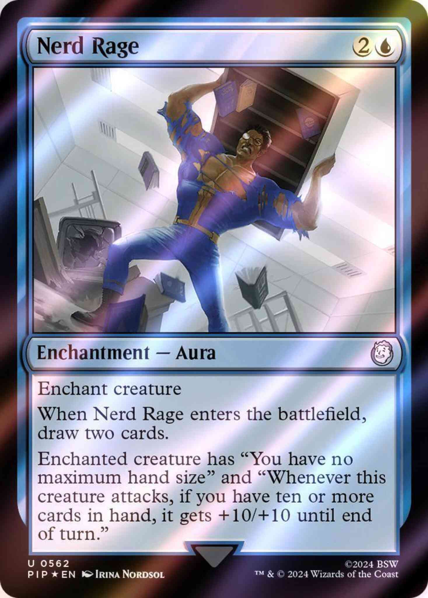 Enchant creature When Nerd Rage enters the battlefield, draw two cards. Enchanted creature has "You have no maximum hand size" and "Whenever this creature attacks, if you have ten or more cards in hand, it gets +10/+10 until end of turn."
