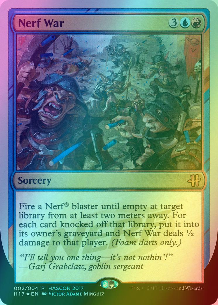 Card Text: Fire a Nerf® blaster until empty at target library from at least two meters away. For each card knocked off that library, put it into its owner's graveyard and Nerf War deals ½ damage to that player. (Foam darts only.)