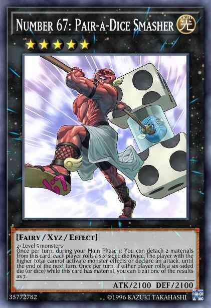 Once per turn, during your Main Phase 1: You can detach 2 materials from this card; each player rolls a six-sided die twice. The player with the higher total cannot activate monster effects or declare an attack, until the end of the next turn. Once per turn, if either player rolls a six-sided die (or dice) while this card has material, you can treat one of the results as 7.