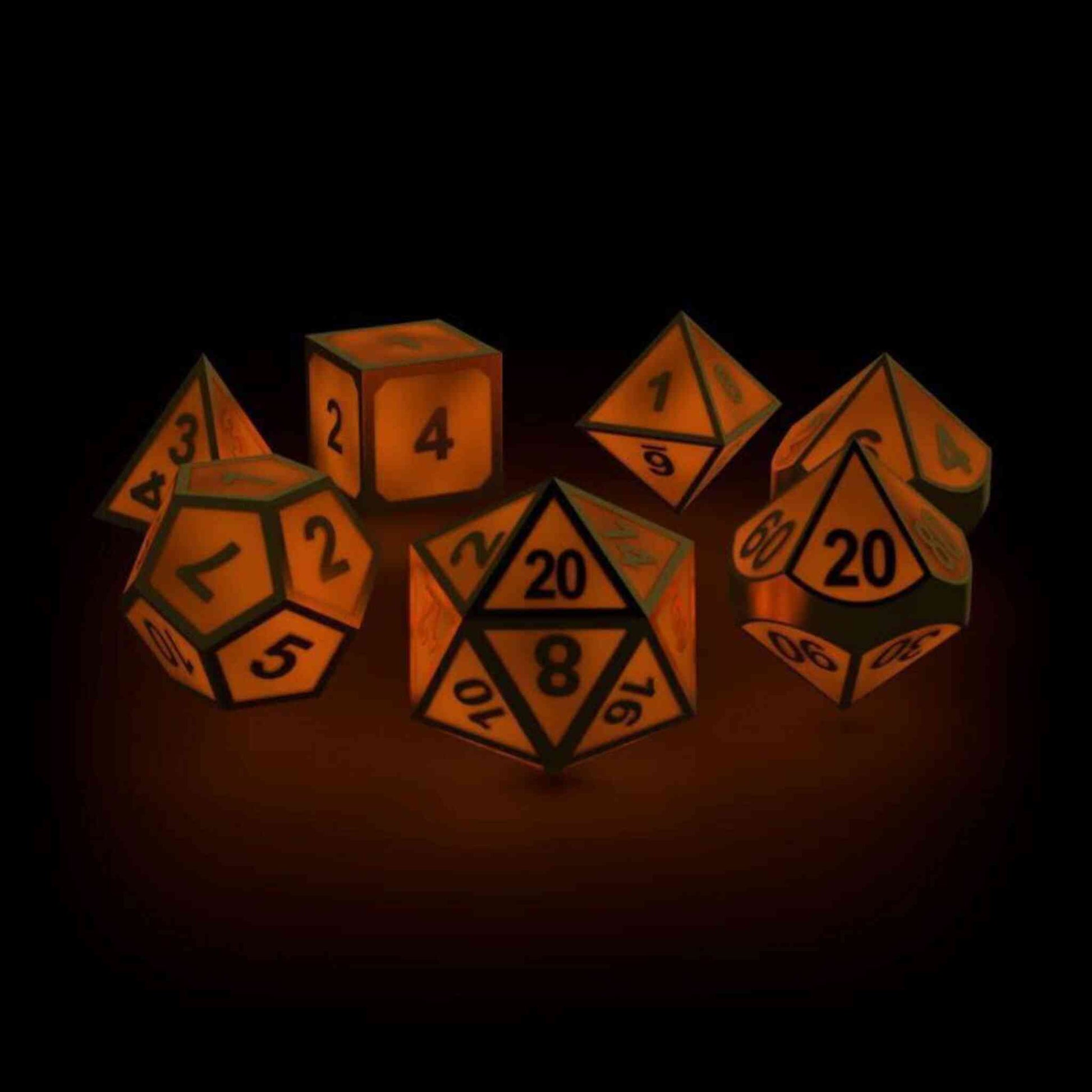 These dice are made from metal which you can tell by their slightly greater weight. Another specialty feature is the sides which glow in the dark. Try it: Turn your lights off, and the dice turn on!