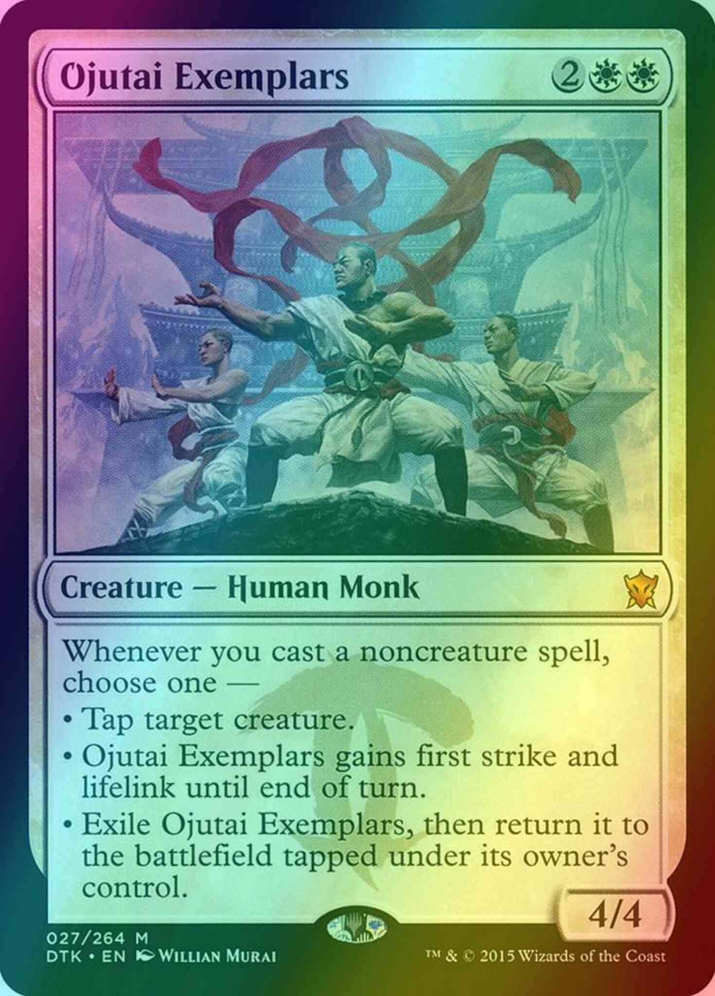 Card Text: Whenever you cast a noncreature spell, choose one — • Tap target creature. • Ojutai Exemplars gains first strike and lifelink until end of turn. • Exile Ojutai Exemplars, then return it to the battlefield tapped under its owner's control.