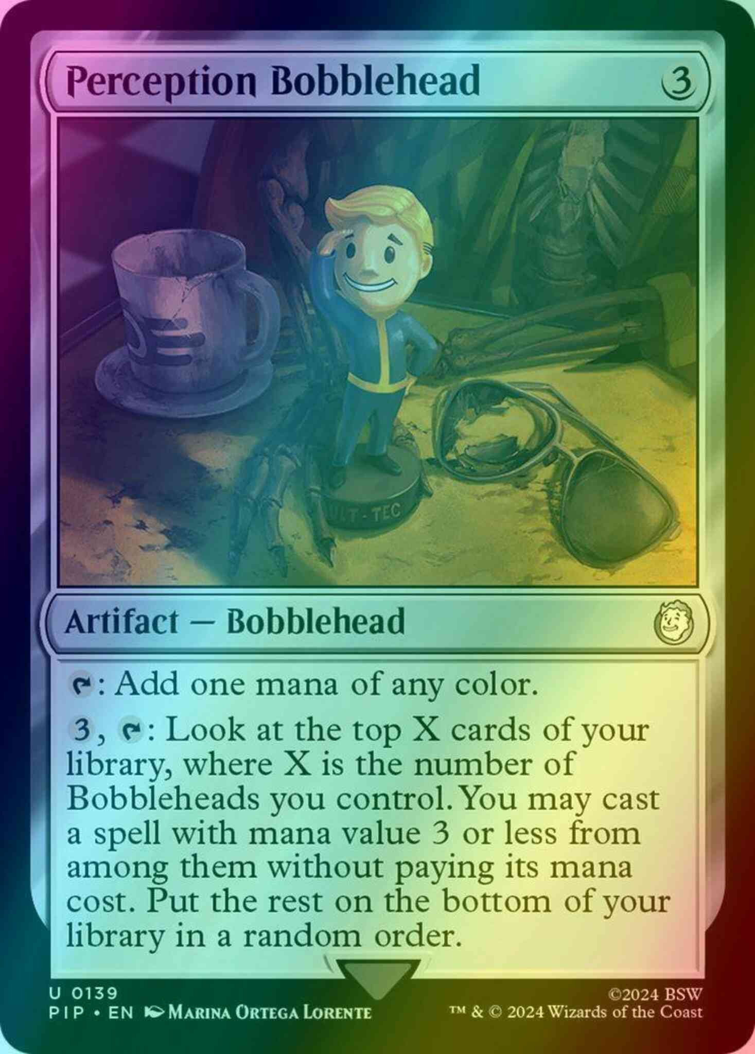 {T}: Add one mana of any color. {3}, {T}: Look at the top X cards of your library, where X is the number of Bobbleheads you control. You may cast a spell with mana value 3 or less from among them without paying its mana cost. Put the rest on the bottom of your library in a random order.
