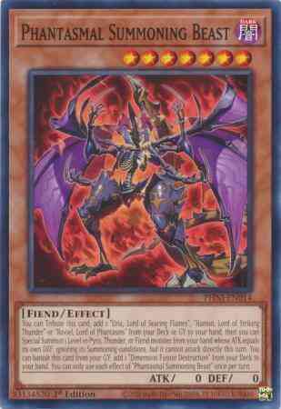 You can Tribute this card; add 1 "Uria, Lord of Searing Flames", "Hamon, Lord of Striking Thunder" or "Raviel, Lord of Phantasms" from your Deck or GY to your hand, then you can Special Summon 1 Level 10 Pyro, Thunder, or Fiend monster from your hand whose ATK equals its own DEF, ignoring its Summoning conditions, but it cannot attack directly this turn. You can banish this card from your GY; add 1 "Dimension Fusion Destruction" from your Deck to your hand. You can only use each effect of "Phantasmal Summoning Beast" once per turn.