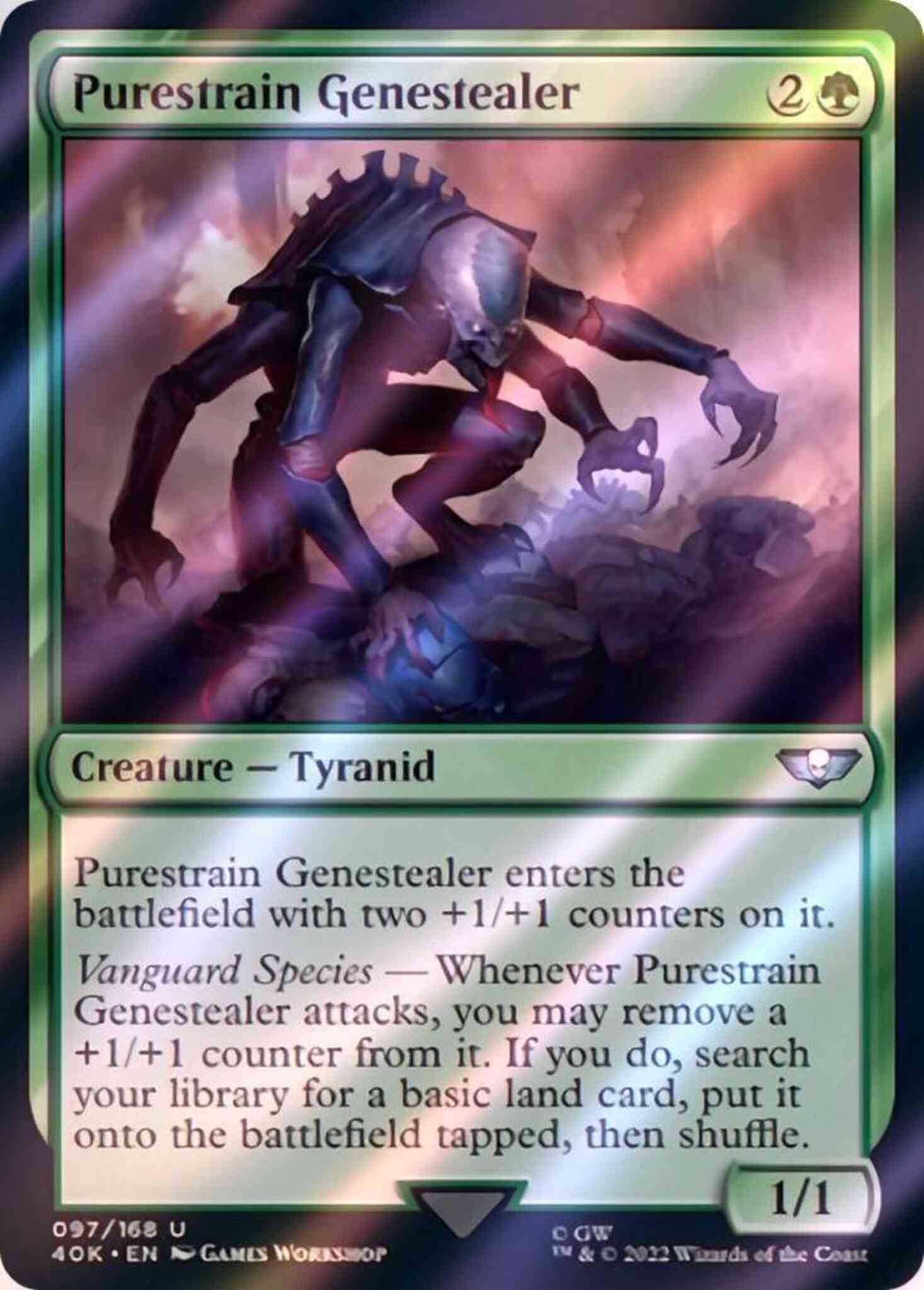 Vanguard Species — Whenever Purestrain Genestealer attacks, you may remove a +1/+1 counter from it. If you do, search your library for a basic land card, put it onto the battlefield tapped, then shuffle.