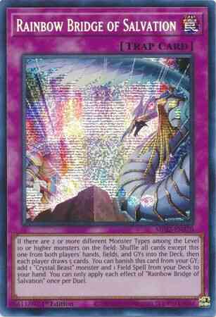 If there are 2 or more different Monster Types among the Level 10 or higher monsters on the field: Shuffle all cards except this one from both players' hands, fields, and GYs into the Deck, then each player draws 5 cards. You can banish this card from your GY; add 1 "Crystal Beast" monster and 1 Field Spell from your Deck to your hand. You can only apply each effect of "Rainbow Bridge of Salvation" once per Duel.
