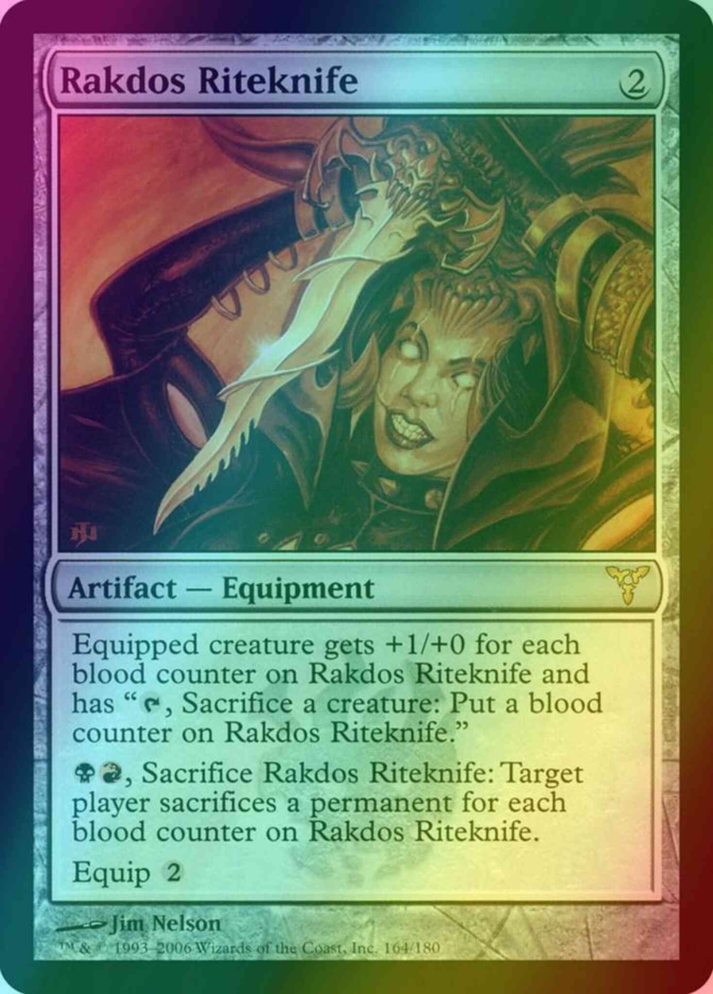 Equipped creature gets +1/+0 for each blood counter on Rakdos Riteknife and has "{T}, Sacrifice a creature: Put a blood counter on Rakdos Riteknife."