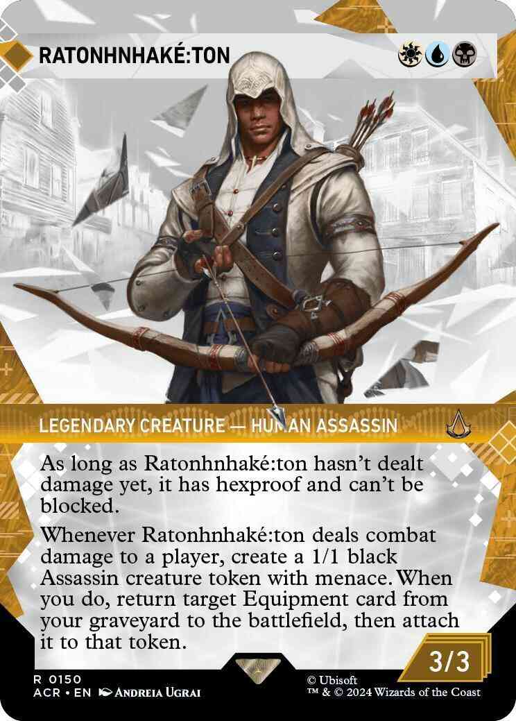 As long as Ratonhnhaké꞉ton hasn't dealt damage yet, it has hexproof and can't be blocked. Whenever Ratonhnhaké꞉ton deals combat damage to a player, create a 1/1 black Assassin creature token with menace. When you do, return target Equipment card from your graveyard to the battlefield, then attach it to that token.