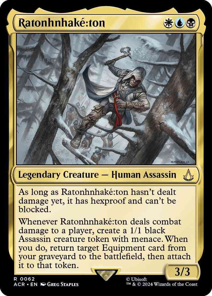 As long as Ratonhnhaké꞉ton hasn't dealt damage yet, it has hexproof and can't be blocked. Whenever Ratonhnhaké꞉ton deals combat damage to a player, create a 1/1 black Assassin creature token with menace. When you do, return target Equipment card from your graveyard to the battlefield, then attach it to that token.