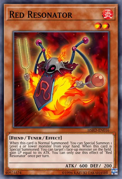 When this card is Normal Summoned: You can Special Summon 1 Level 4 or lower monster from your hand. When this card is Special Summoned: You can target 1 face-up monster on the field; gain LP equal to its ATK. You can only use this effect of "Red Resonator" once per turn.