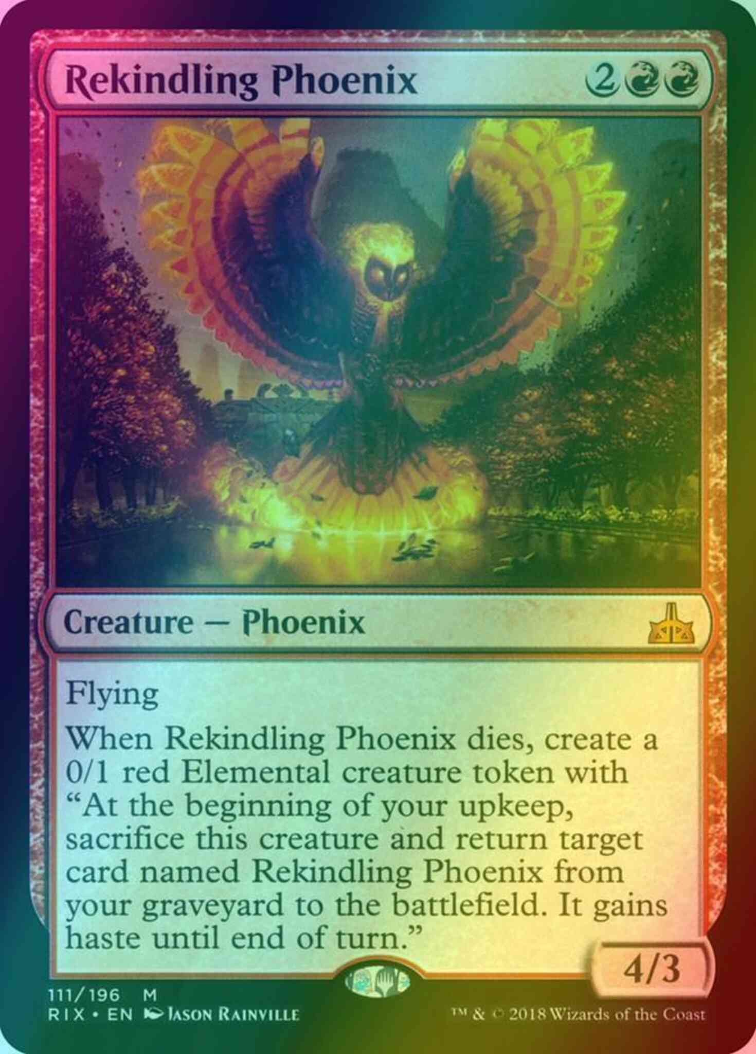 When Rekindling Phoenix dies, create a 0/1 red Elemental creature token with "At the beginning of your upkeep, sacrifice this creature and return target card named Rekindling Phoenix from your graveyard to the battlefield. It gains haste until end of turn."