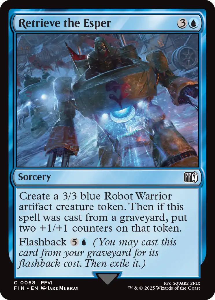 Card Text: Create a 3/3 blue Robot Warrior artifact creature token. Then if this spell was cast from a graveyard, put two +1/+1 counters on that token. Flashback {5}{U} (You may cast this card from your graveyard for its flashback cost. Then exile it.)