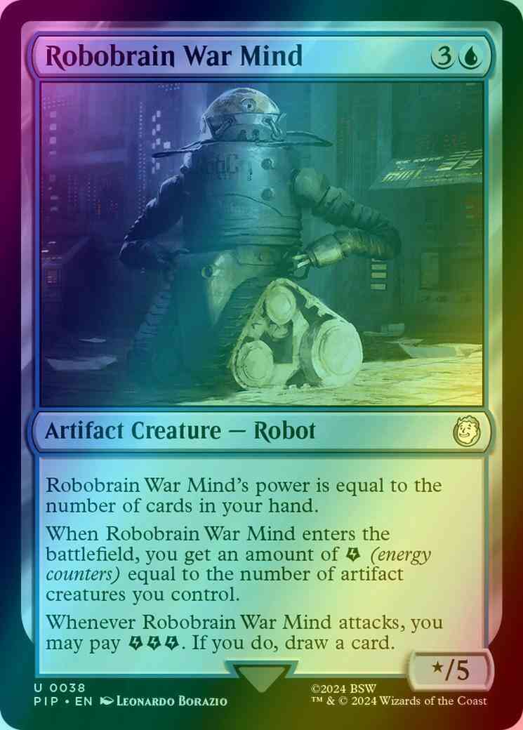 Card Text: Robobrain War Mind's power is equal to the number of cards in your hand. When Robobrain War Mind enters the battlefield, you get an amount of {E} (energy counters) equal to the number of artifact creatures you control. Whenever Robobrain War Mind attacks, you may pay {E}{E}{E}. If you do, draw a card.