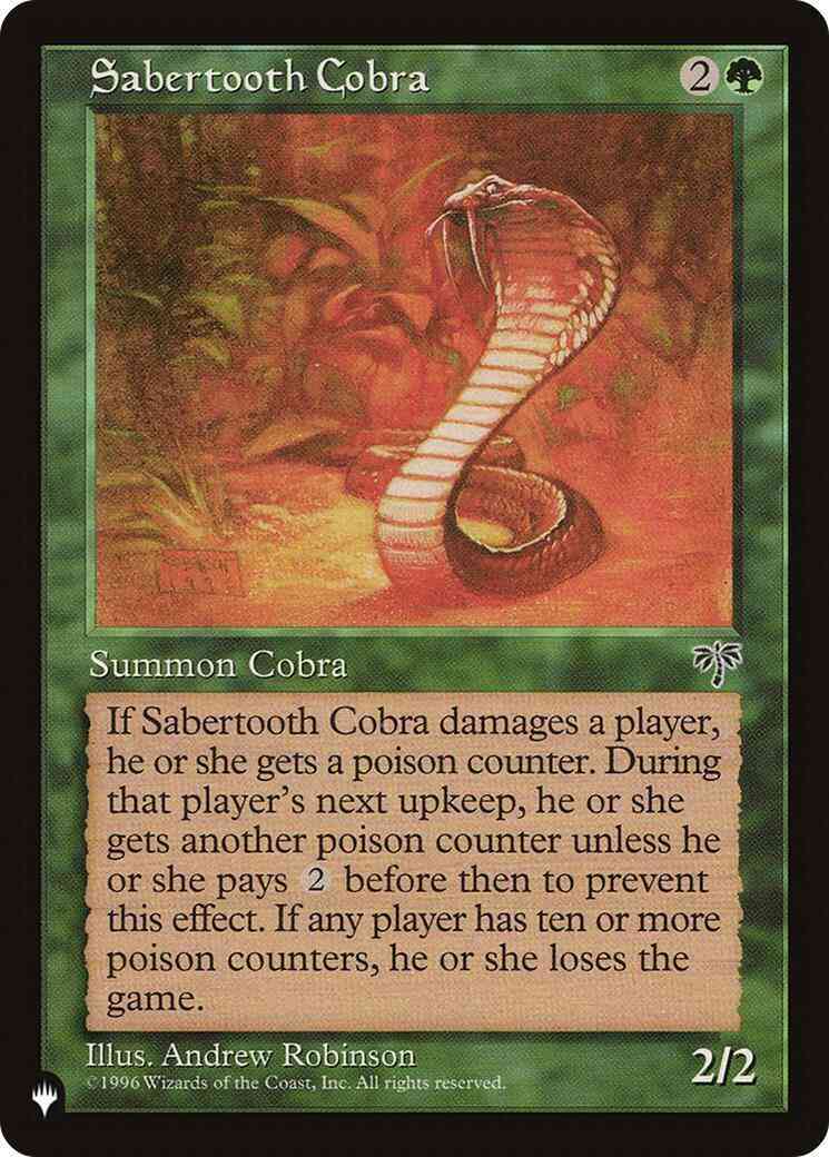 Card Text: Whenever Sabertooth Cobra deals damage to a player, that player gets a poison counter. The player gets another poison counter at the beginning of their next upkeep unless they pay {2} before that step. (A player with ten or more poison counters loses the game.)