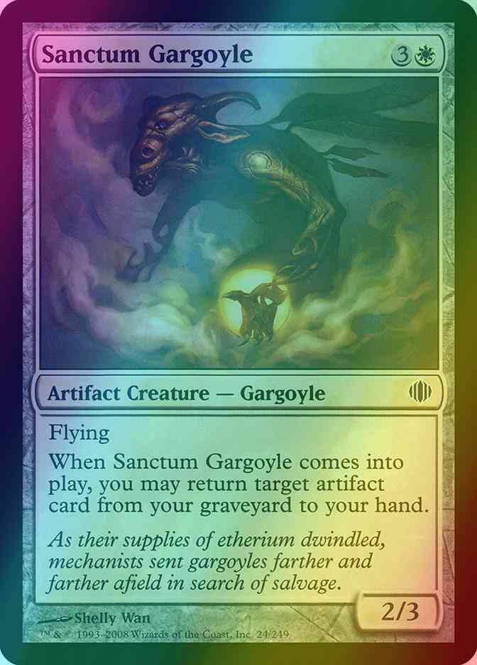 When Sanctum Gargoyle enters the battlefield, you may return target artifact card from your graveyard to your hand.
