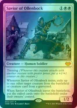 Whenever Savior of Ollenbock trains, exile up to one other target creature from the battlefield or creature card from a graveyard.