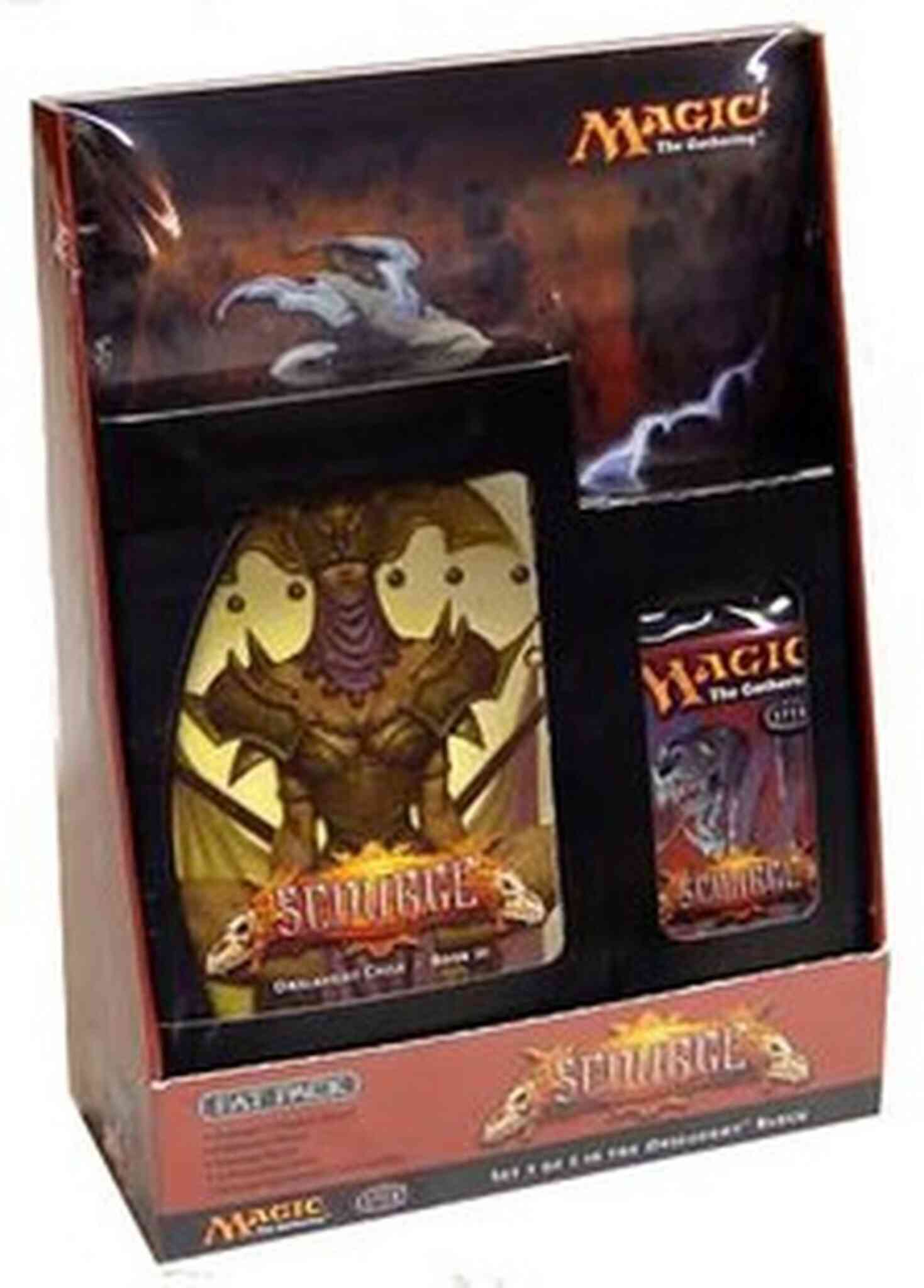 Includes a player’s guide with pictures of all cards in the set, six 15-card booster packs, one foil basic land card, one random foil card, the Scourge novel, and a special-edition life counter.