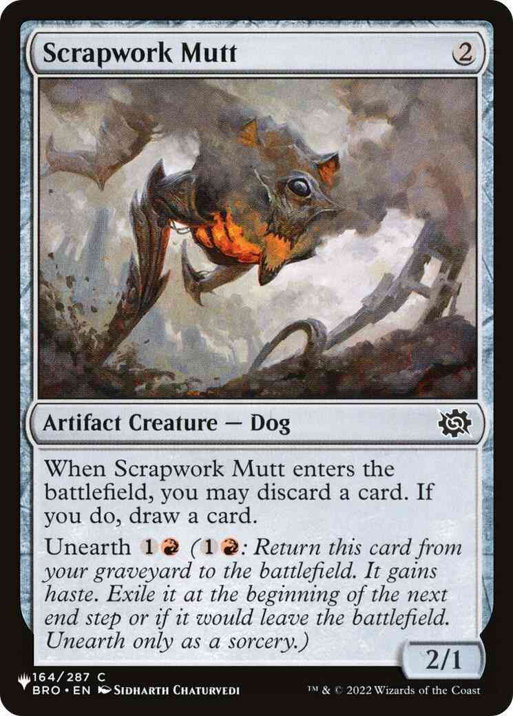 When Scrapwork Mutt enters, you may discard a card. If you do, draw a card. Unearth {1}{R} ({1}{R}: Return this card from your graveyard to the battlefield. It gains haste. Exile it at the beginning of the next end step or if it would leave the battlefield. Unearth only as a sorcery.)