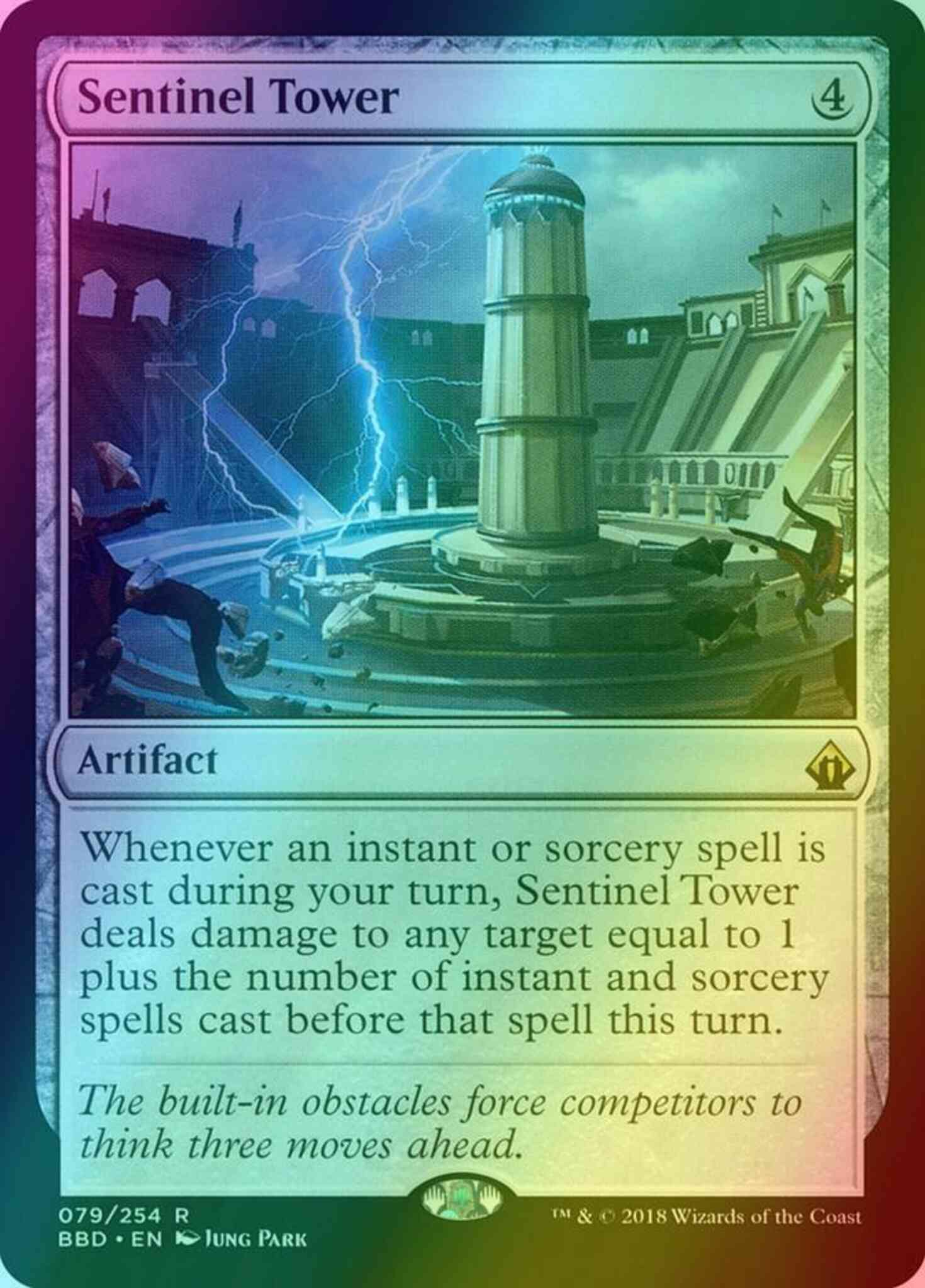 Card Text: Whenever an instant or sorcery spell is cast during your turn, Sentinel Tower deals damage to any target equal to 1 plus the number of instant and sorcery spells cast before that spell this turn.